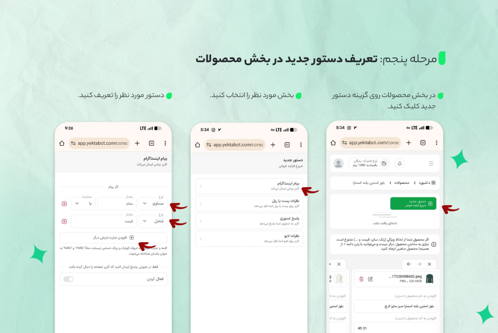 میتوانید با ساخت دستور، به محض دریافت پیامی خاص در دایرکت، محصول تعریف شدهی خود را برای مشتری به نمایش بگذارید.