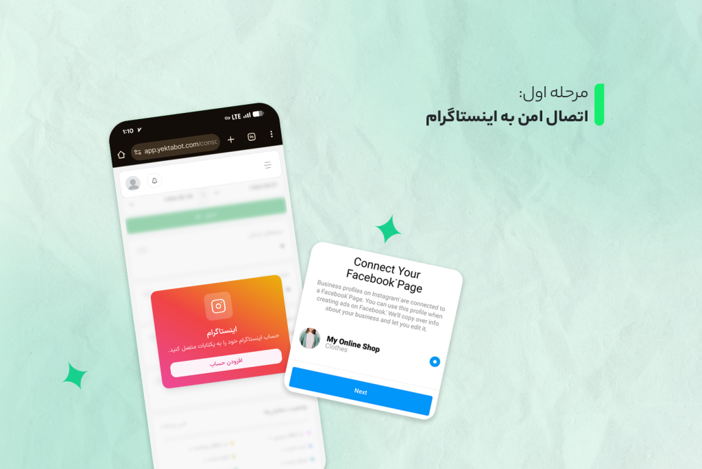اولین کار، وصل کردن اکانت اینستاگرام خود به یکتابات است. با نام اکانت فروشگاه اینستاگرامی خود و رمز عبور وارد میشوید. برای امنیت بیشتر، اتصال به پیج از طریق Facebook API رسمی انجام میشود. این یعنی بدون نگرانی از بلاک یا نقض قوانین اینستاگرام، میتوانید فروشگاه خود را به یکتابات وصل کنید. اگر اکانت اینستاگرام شما شخصی است باید آن را به حالتCreator یا Business تغییر دهید.