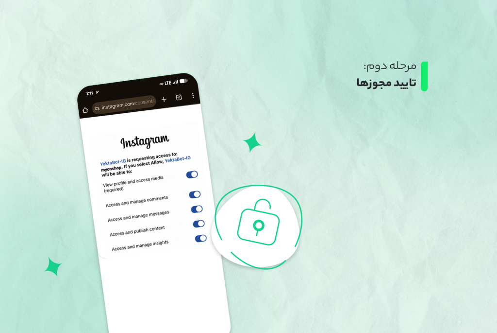 در این مرحله باید مجوزهای لازم مانند اتصال به Messages ، Accounts و Contentرا تایید کنید تا ربات بتواند پیامها و سفارشها را مدیریت کند.