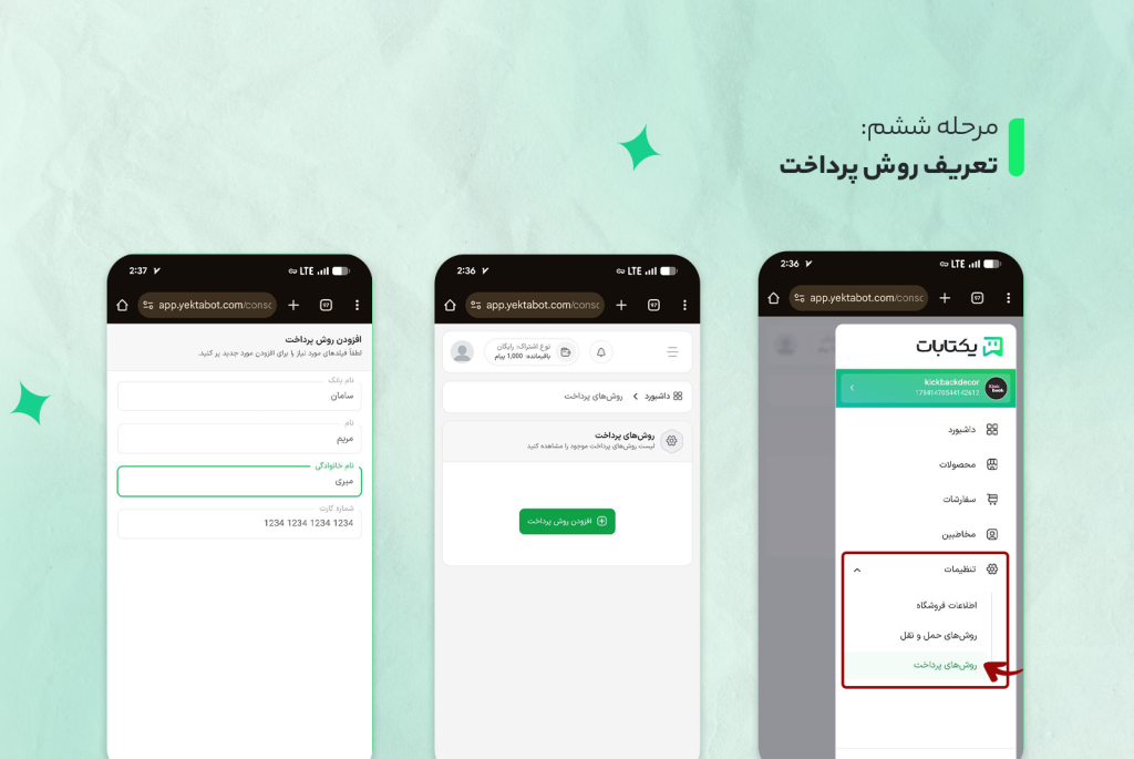 - در منوی تنظیمات، روشهای پرداخت را انتخاب کنید و افزودن روش پرداخت را بزنید.